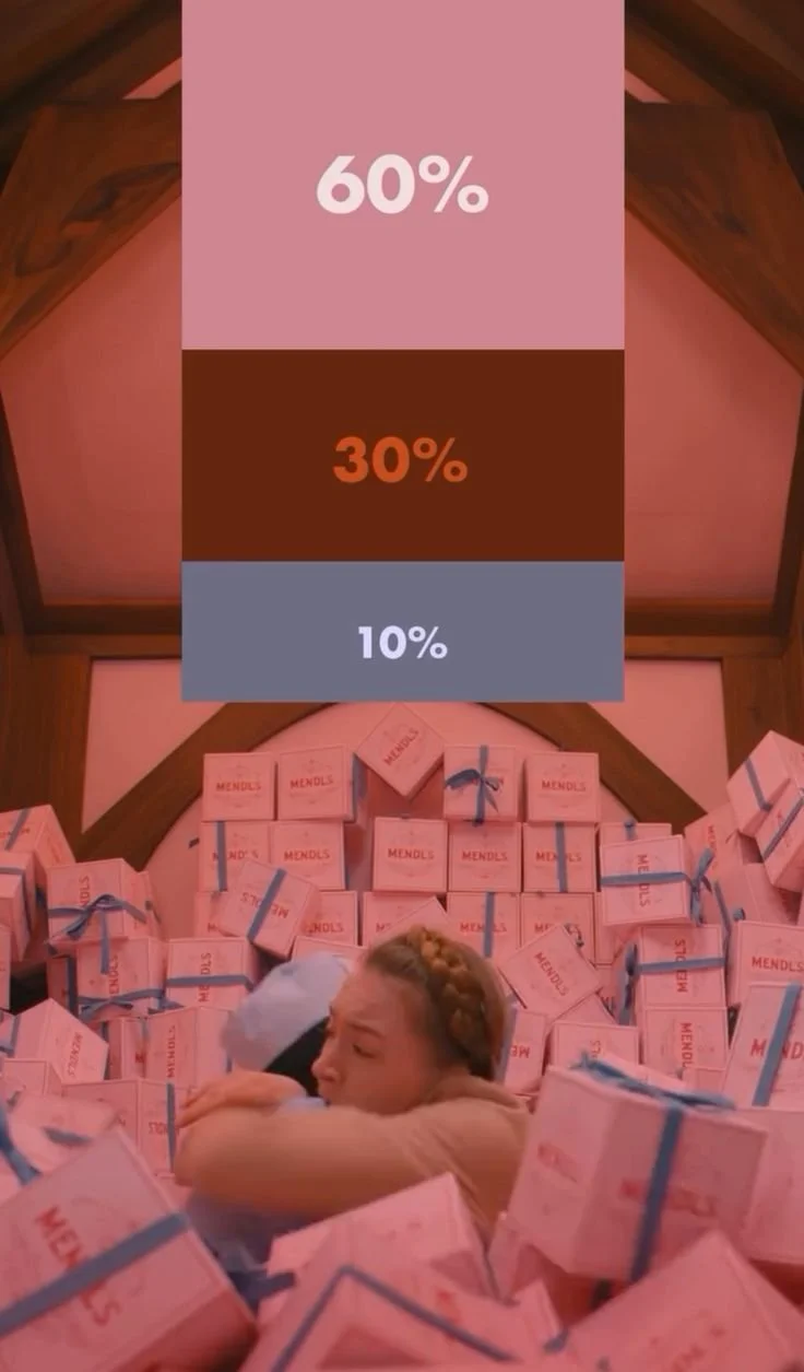 Wes Anderson works with something called the 60-30-10 rule. Sixty percent of a scene is one dominant colour that sets the overall mood. Thirty percent is a supporting colour that adds depth without competing. Ten percent is a bold accent, placed exactly where he wants your eye to go.